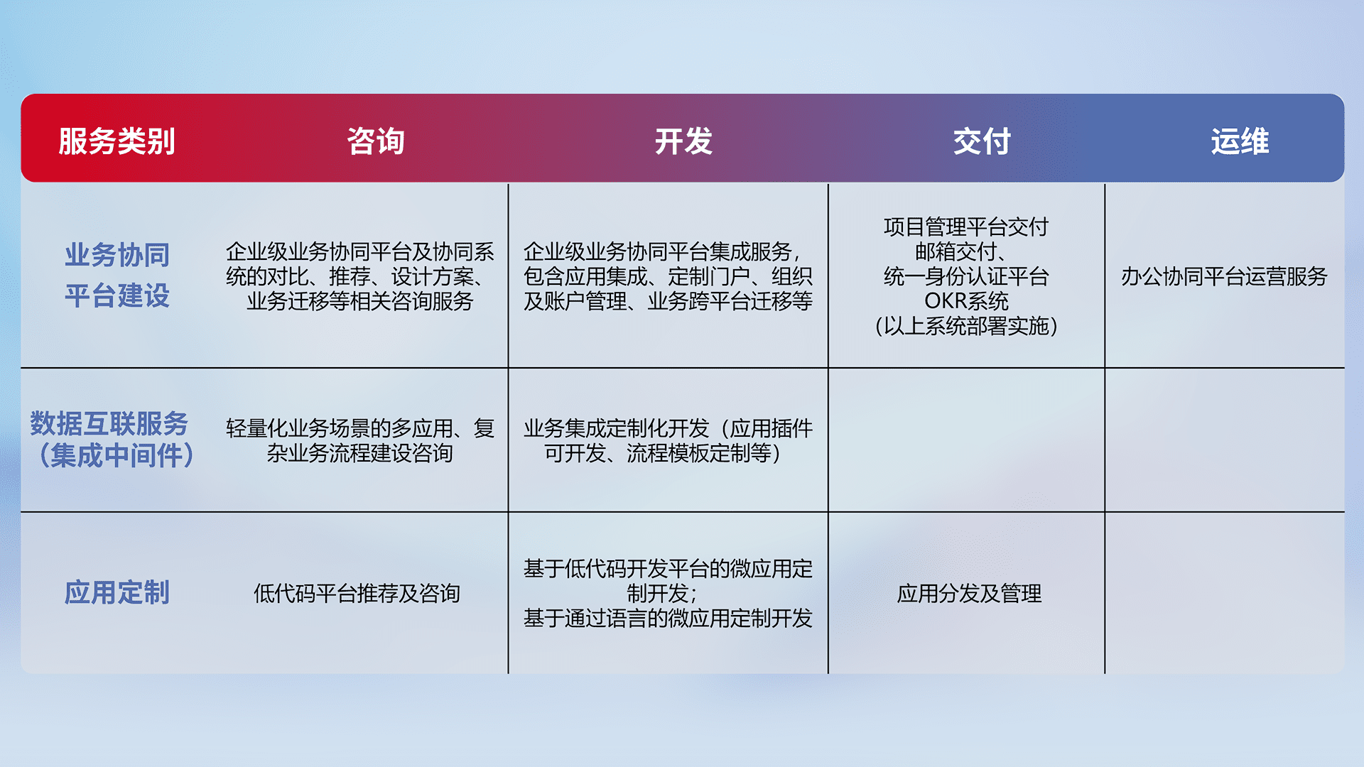 针对钉钉、、、、企微、、IDaas等平台级产品提供产品的规划、、、、方案、、、、交付、、定制化开发等服务,,实现如统一协同办公、、、、智能客户服务、、、混合会议管理、、智能数据查询、、、等业务场景,,,实现数字化转型。。。。