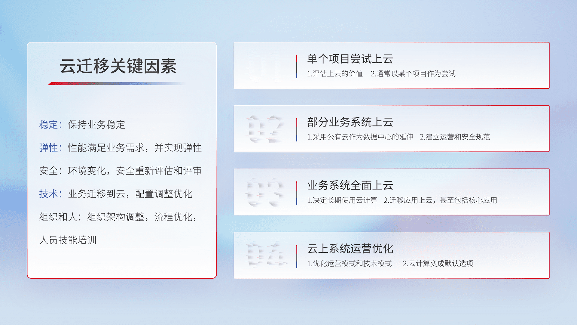 结合实际业务,,,,从规划设计、、、、云平台选型、、、、云原生改造、、数据迁移、、、、集成交付,,迁移全过程为客户识别最佳上云路径,,,,做好风险识别管理,,设计网络架构、、、、身份权限、、、安全审计合规、、、操作审计、、、日志审计、、、、监控告警策略、、、多站点容灾设计等,,对云上基础设施进行整体规划,,,,提升IT治理水平,,,以满足弹性、、高可用、、、高性能的需求。。