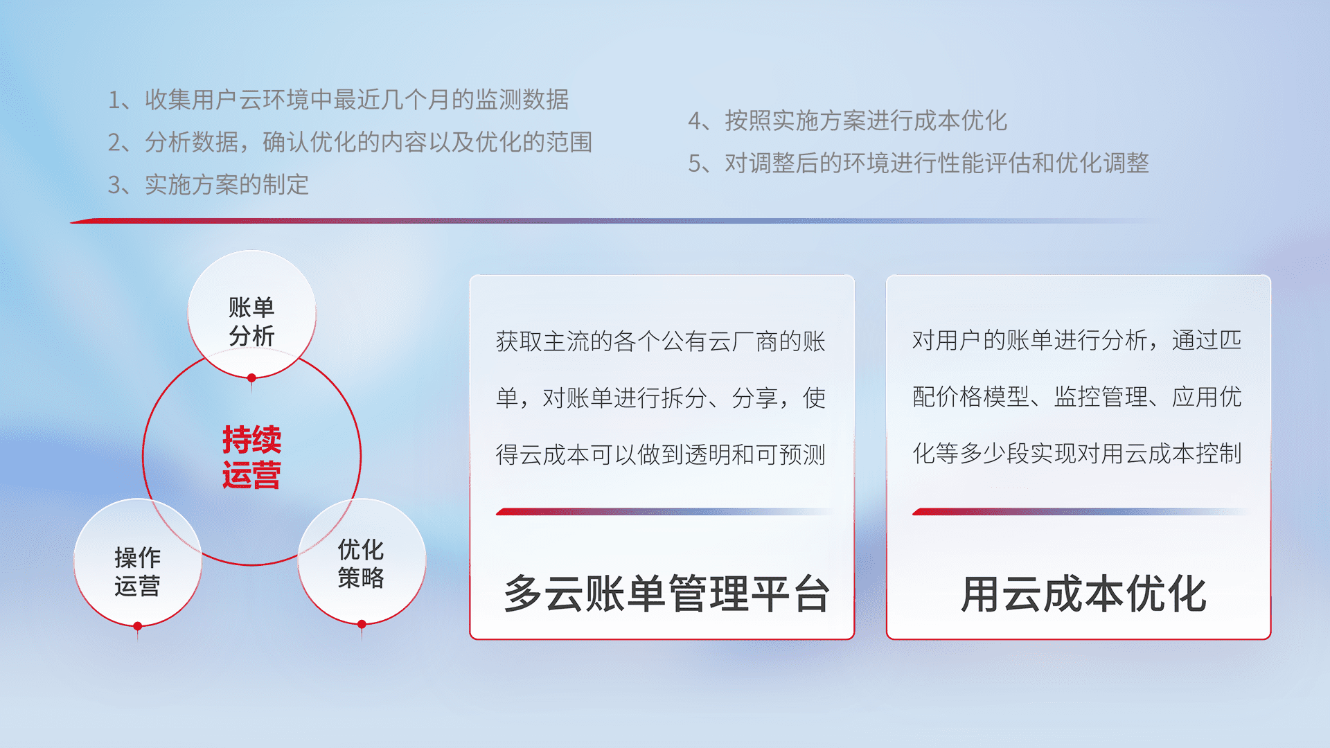 通过多云纳管,,,,以统一的资源数据模型把客户的云资源进行抽象和封装,,,进而实现对多云资源的统一操作,,保障云资源管理的可靠性、、稳定性与可用性。。。。量身定制化运维内容,,,,配置、、、、开发运维、、、、补丁管理、、、、备份、、监控、、、认证和访问管理、、、审计和日常巡检等,,,保障在用云过程中的可靠度,,,稳定度以及高可用率。。。。