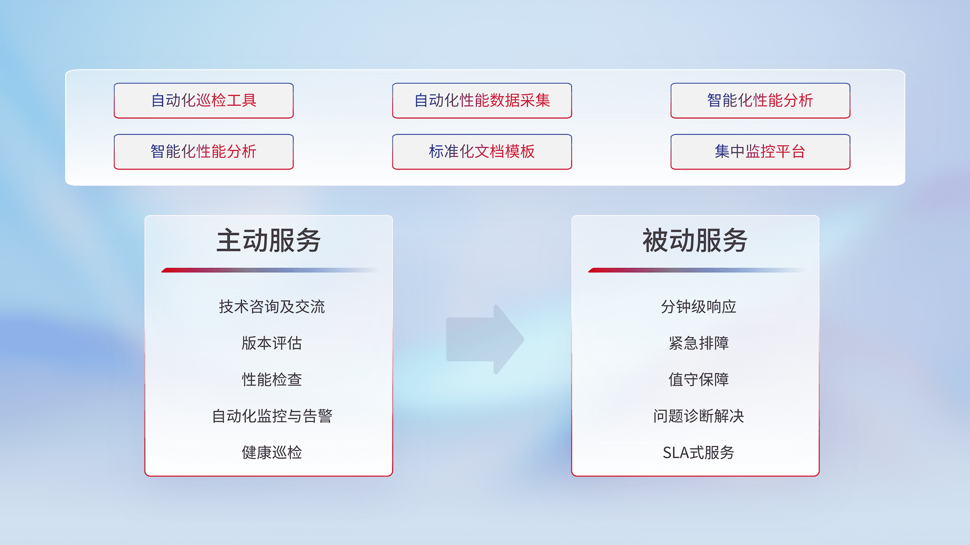 智能化工具和标准化文档,,保障服务质量,,,提供主动服务(包含技术咨询、、、版本评估、、性能检查、、自动化监控与告警、、健康巡检)和被动服务包含(分钟级响应、、、、紧急排障、、值守保障、、问题诊断解决、、、、SLA服务)。。